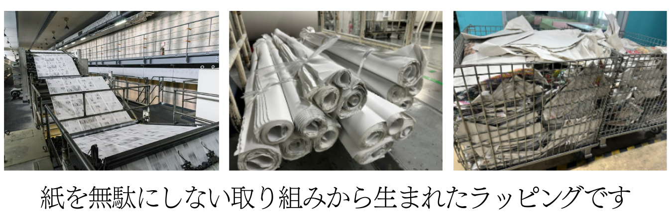 大量に印刷する際のどうしても使い切れない新聞紙を活用して、オリジナルデザインのラッピング用紙が誕生しました。