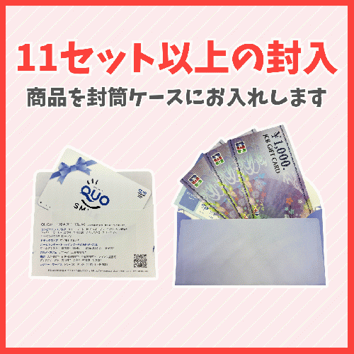 例①:図書カード1000円券×15枚を1枚ずつ15セット分を図書カード専用ケースに封入ご希望の場合 10セット分→無料 5セット分→1セットにつき55円(税込)のため 計275円(税込)の封入手数料代の追加となります。 このページの商品を5個カゴに入れてください。 カゴの中見本 備考欄入力見本 例②:JCBギフトカード1000×400枚を10枚1セットにして40セット分をJCB専用ケースに封入ご希望の場合 10セット分→無料 30セット分→1セットにつき55円(税込)のため 計1,650円(税込)の封入手数料代追加となります。 このページの商品を30個カゴに入れてください。 カゴの中見本 備考欄入力見本 ※封入の内訳のご指定はご注文画面の備考欄にお願いします。 ※セット数が大量の場合は、ご入金確認後の封入作業から発送までに3営業日以上お時間を頂戴する場合が御座います。予めご了承下さい。 ★封入に関してご不明な点等はお問い合わせください★ TEL:045-548-9807 (受付時間 / 平日10:00〜18:30) お問い合わせフォームはこちら