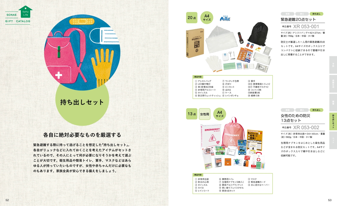 防災用品ギフト「RING BELL SONAE」は、厳選した防災グッズや備蓄食品を集めたカタログギフトです。