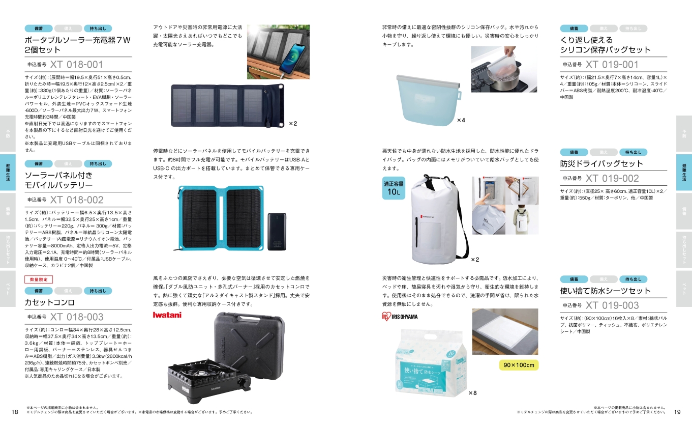 耐震グッズなどの予防用品や避難生活のための防災バッグ、備蓄食料、生活用品など基本的な防災対策用品に加え、お子様・女性・シニア向けの避難セット、ペット用の防災グッズなど、ご家庭に合わせて必要な品をお選びいただけます。