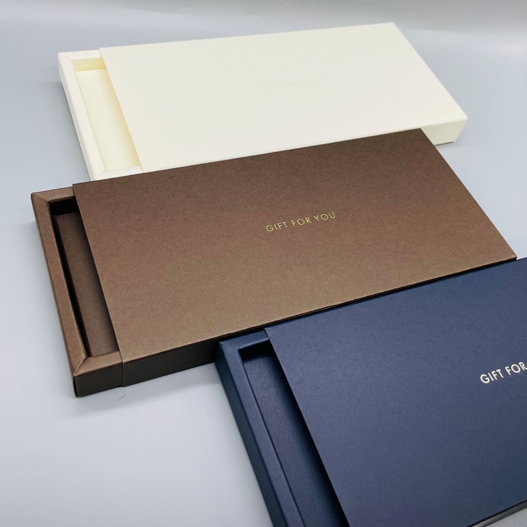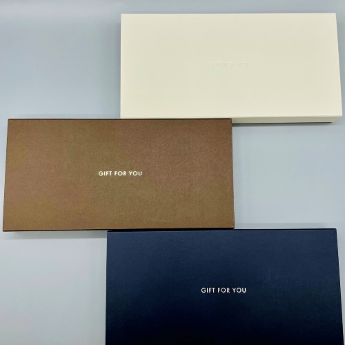 商品券、カードサイズのギフト用のスリーブタイプのギフトボックスです。 ご一緒にご購入いただいた商品券やクオカード、図書カード等を封入してお届けすることが可能です。 少量の商品券や小さなカード1枚でも綺麗に封入することができます。 中の台座を取り外せば商品券が100枚まで入るサイズです。 しっかりとした高級感のある紙製でかしこまったギフトシーンにもご利用いただけます。 色は3種類ご用意しております。 【ホワイト】 ソフトクリームのようなしっとりとした色味です。 【ブラウン】 深みと温かみのある上品なチョコレートカラーです。 【ブルーブラック】 シックで洗礼された印象の青みがかったブラックです。