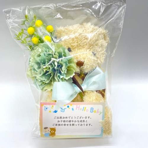 出産祝いに最適なギフトにぬいぐるみと造花を添えたラッピングでお届けするガリレオオリジナルのギフトセットです。