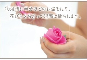 ①浴槽に半分ほどのお湯をはり、花びらをちぎって湯面に散らします。