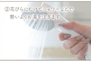 ②花びらにむけてシャワーなどで勢いよくお湯を注ぎます。
