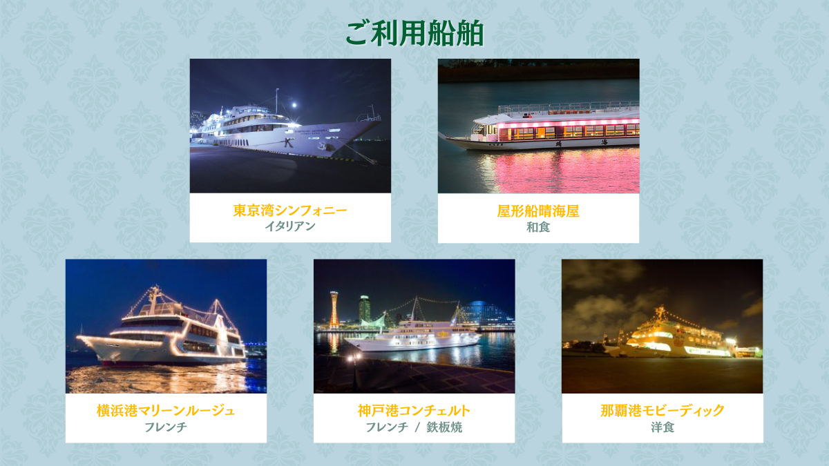 東京・横浜・神戸・那覇、 5のレストランシップとご利用日をお選び頂ける感動のギフト券です。 【ご利用船舶】 ・東京湾シンフォニー / イタリアン ・東京 屋形船晴海屋 / 和食 ・横浜港マリーンルージュ / フレンチ ・神戸港コンチェルト / フレンチ 鉄板焼 ・那覇港モビーディック / 洋食 ご結婚祝いやご結婚記念、銀婚式、還暦のお祝いなど―― さまざまなお祝いやお礼に、ご利用いただけます★ ゴールドのプランはこちら プラチナのプランはこちら また、法人キャンペーンや記念品、 ゴルフコンペや二次会の景品・賞品などにも、オススメ! 幅広いご用途で、皆様に大変喜ばれます♪ 【お客様の声】 ギフト券を頂いた時、決められた船しか乗れないと思い込んでいましたが、 全国のどのクルーズでもOKだと気がつき関西旅行の際に神戸港で 美しい夜景を楽しみながらディナークルーズを堪能して来ました。 とても利便性が高いギフト券で贈って下さった方に感謝です。 東京都:30代主婦 汎用性の高い全国共通クルーズギフト券が見つかりましたので 関東・関西地区での販売キャンペーンで使いましたが大変好評でした。 これからもキャンペーンやイベントで採用させていただきたいと思います。 大手メーカー営業部:30代男性 同窓会のイベントでビンゴ大会の景品にしたら 全国から集まってきているので多くの人が使えると喜んでいました。 きっとどこのレストランシップでも乗れるのが良かったのでしょう。 某大学:同窓会男性幹事